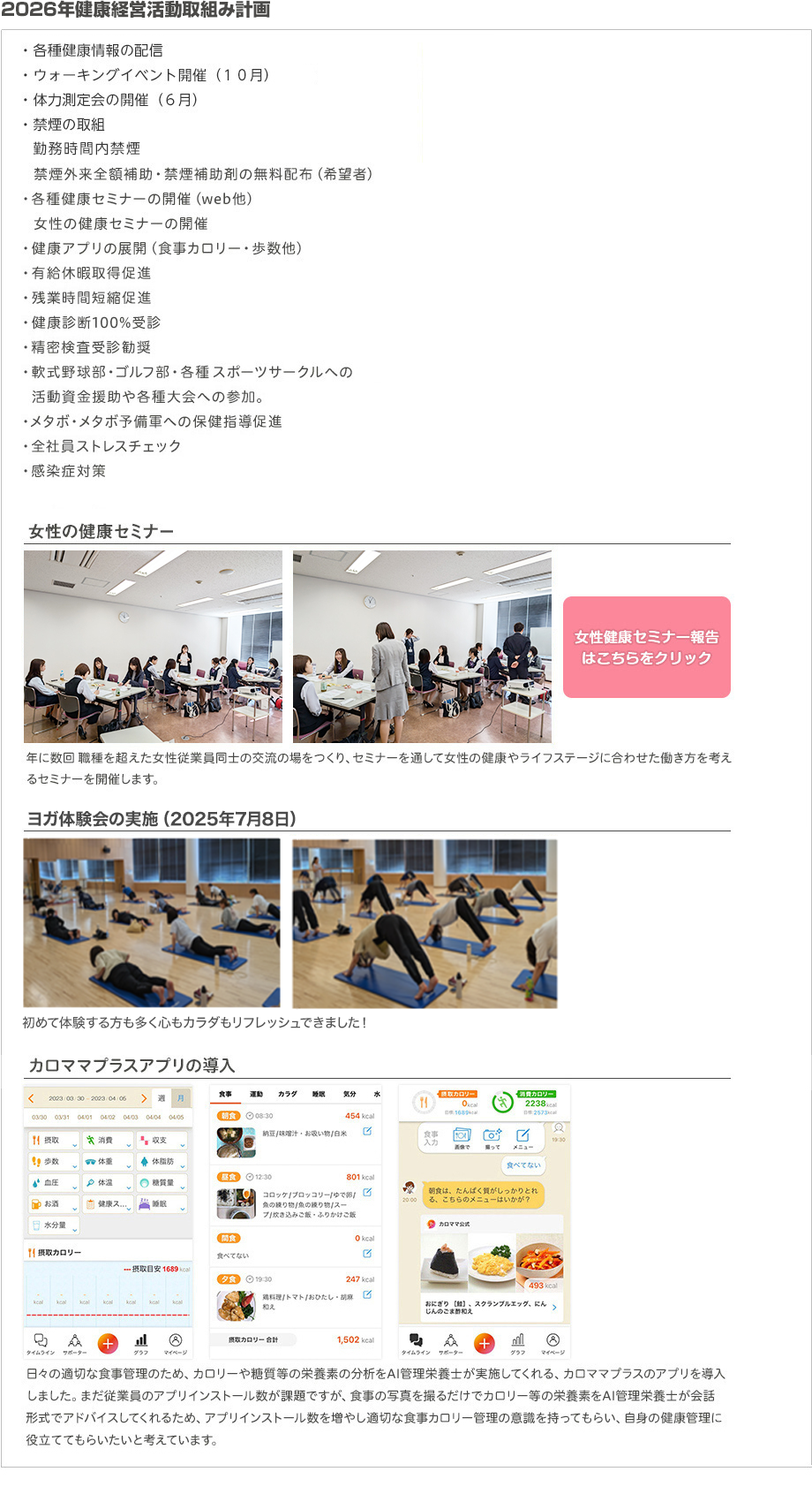 従業員が心身ともに健康であるために、重点取組み目標として、禁煙・運動習慣・歯科検診・休肝日の自己目標にチャレンジしてもらい、さらに健康指標として職場環境・健康状態・生活習慣の重点項目推移を捉え、従業員の健康課題とパフォーマンス向上にむけ取り組んでおります。